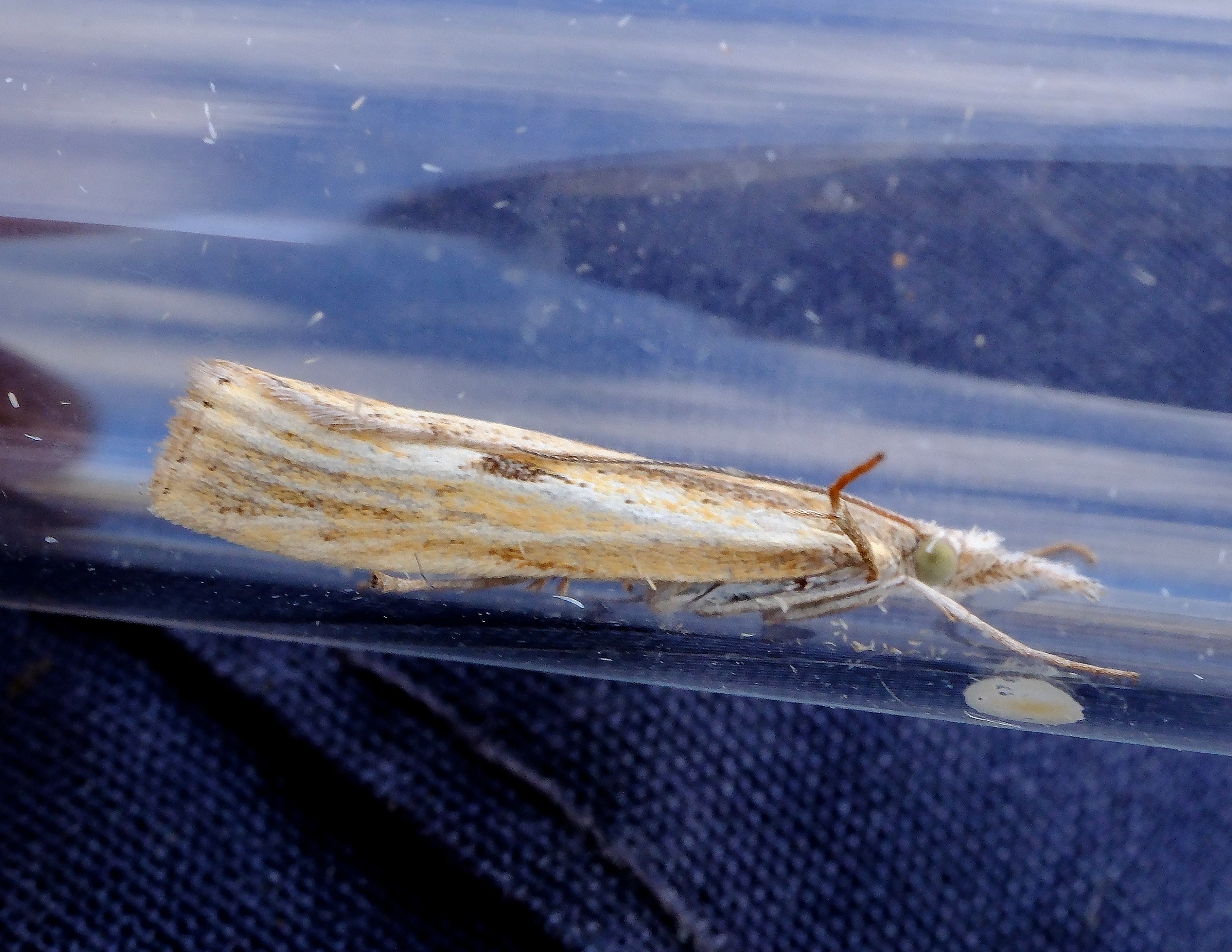 Straw coloured forewings with a disntinctive dark patch on the faint longitudinal streak. Obvious, black spots along the margin of the rear hindwing.