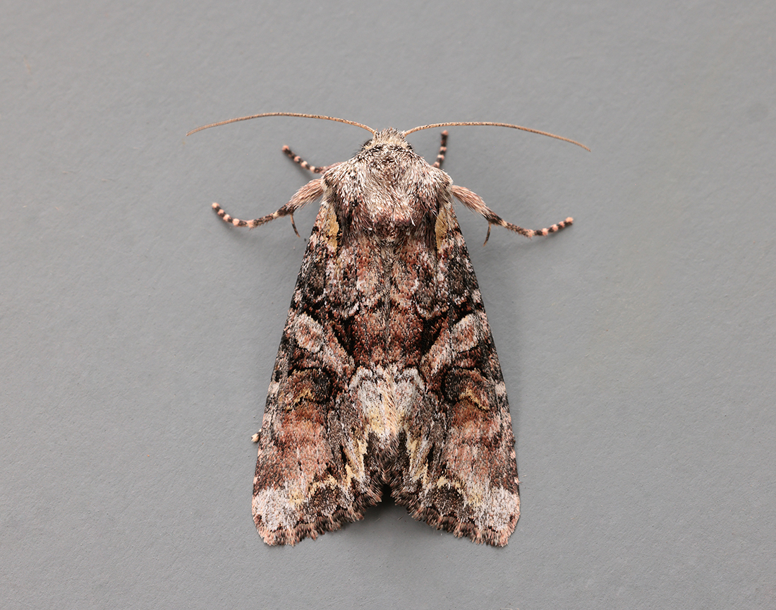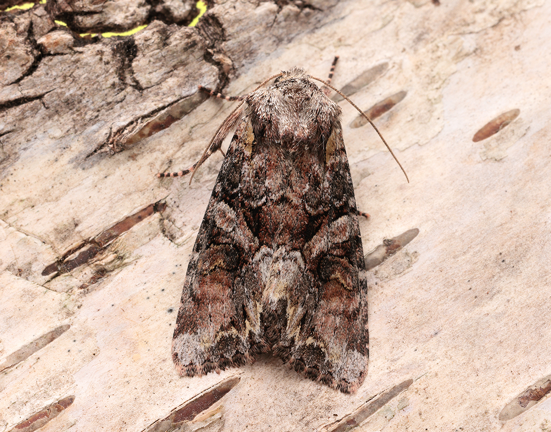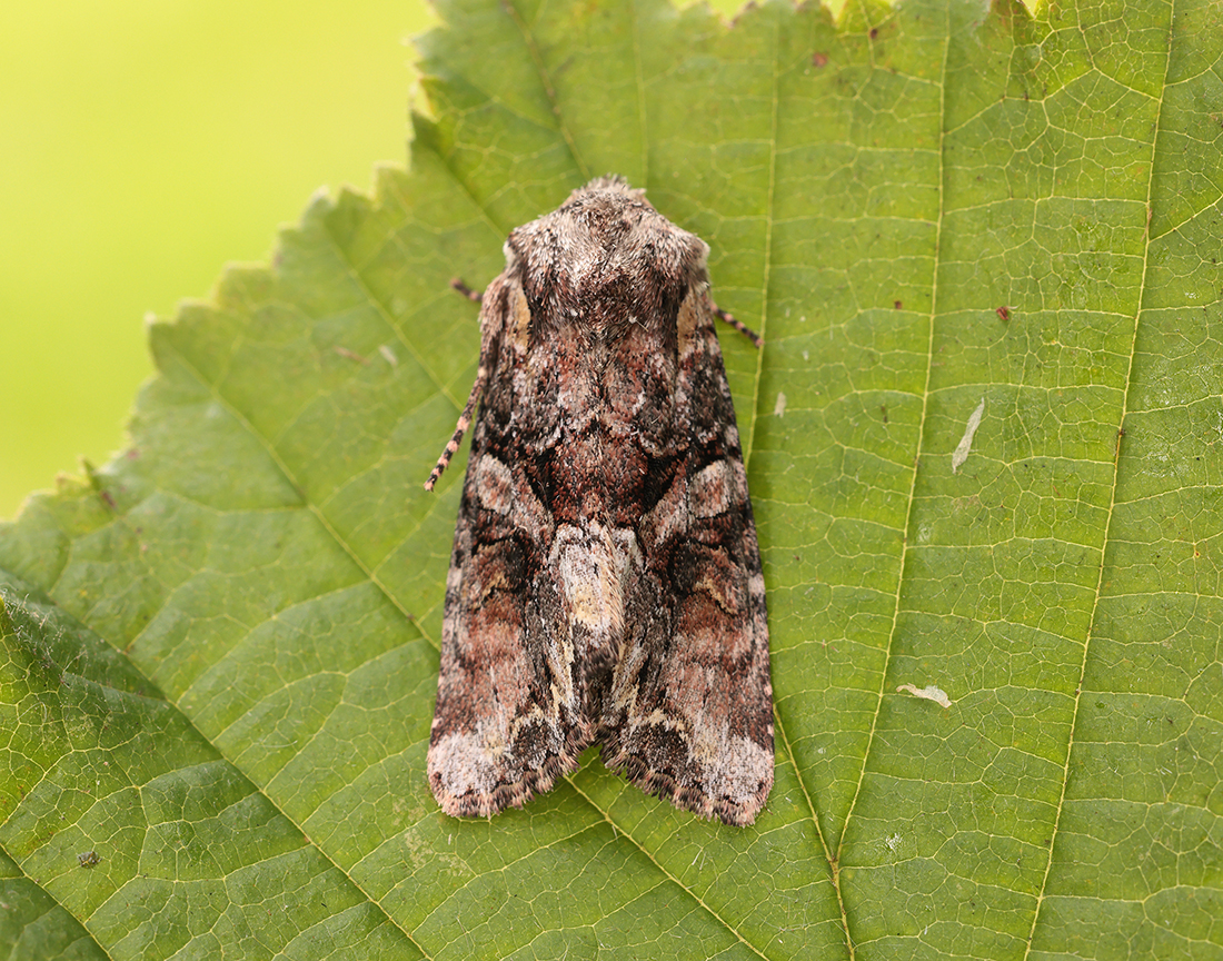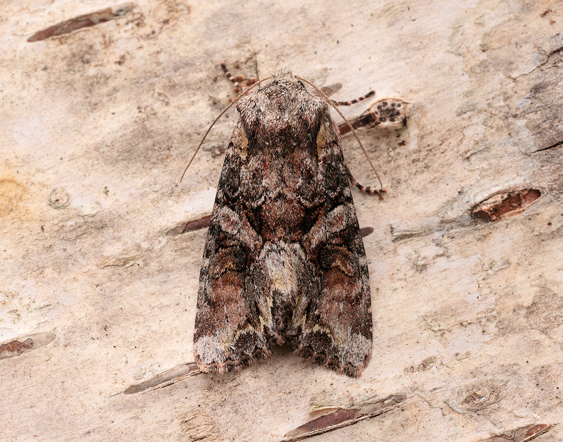 This moth can be distinguished by the marbled appearance and broken whitish oblique band running from the centre to the trailing corner, forming a ‘V’.