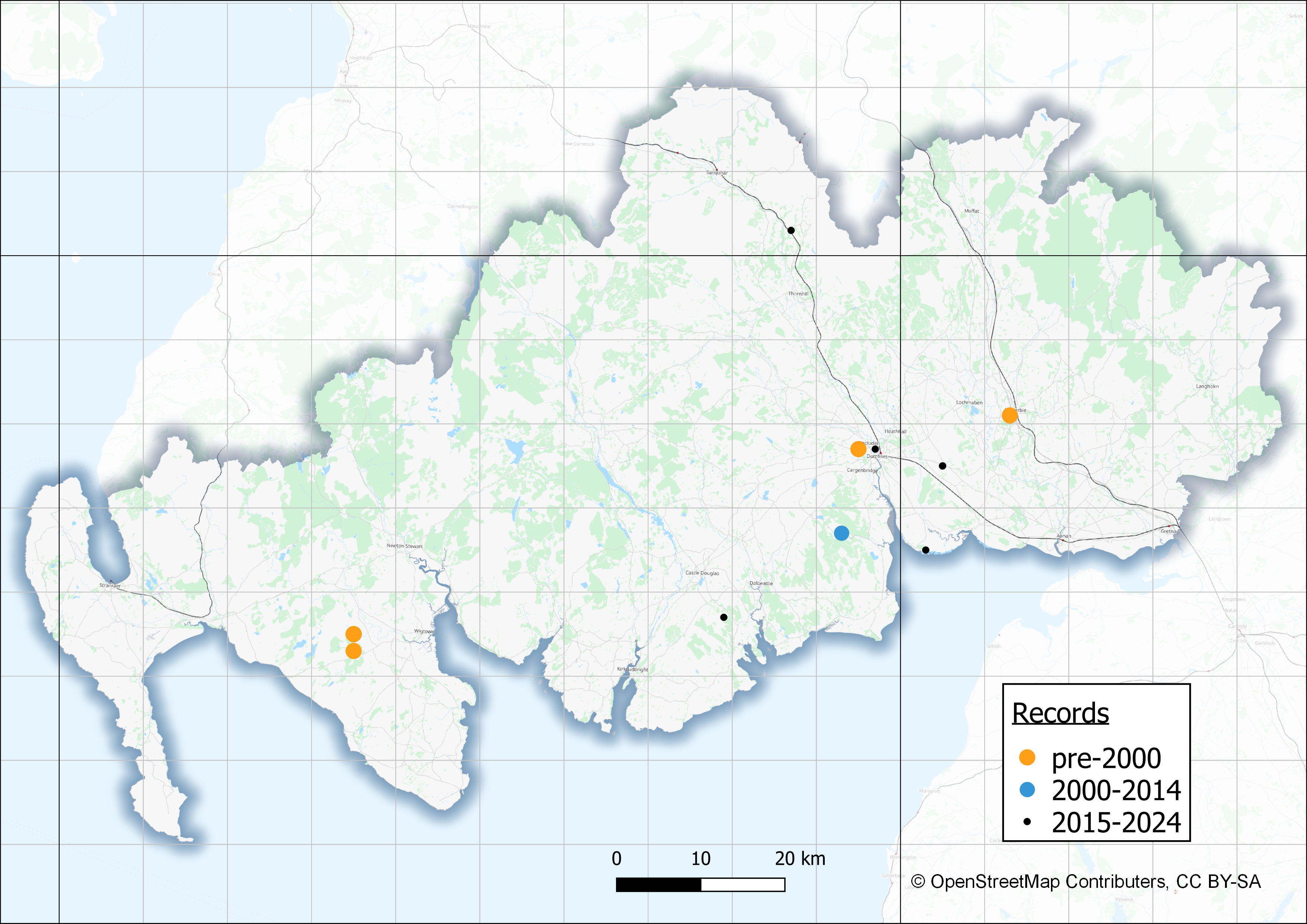Few sightings and current status unclear, but recent records of individuals from sites near Dumfries, Caerlaverock and Kirkcudbright. Brimstones are also seen occasionally in the Carlisle area, but again, the status of these records in unclear as to whether they represent an established colony in the area. Adult females were seen and eggs were photographed on Alder Buckthorn near Dumfries in June 2021 but no larvae were found on later visits.