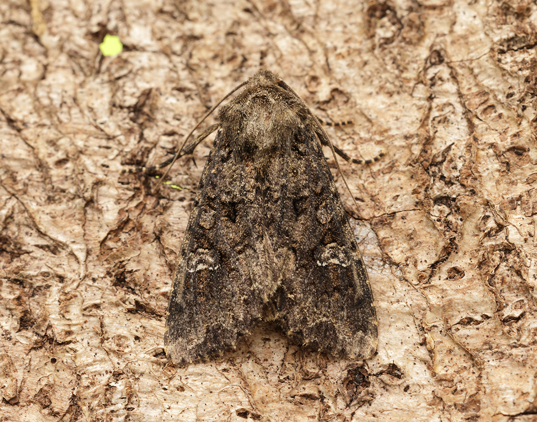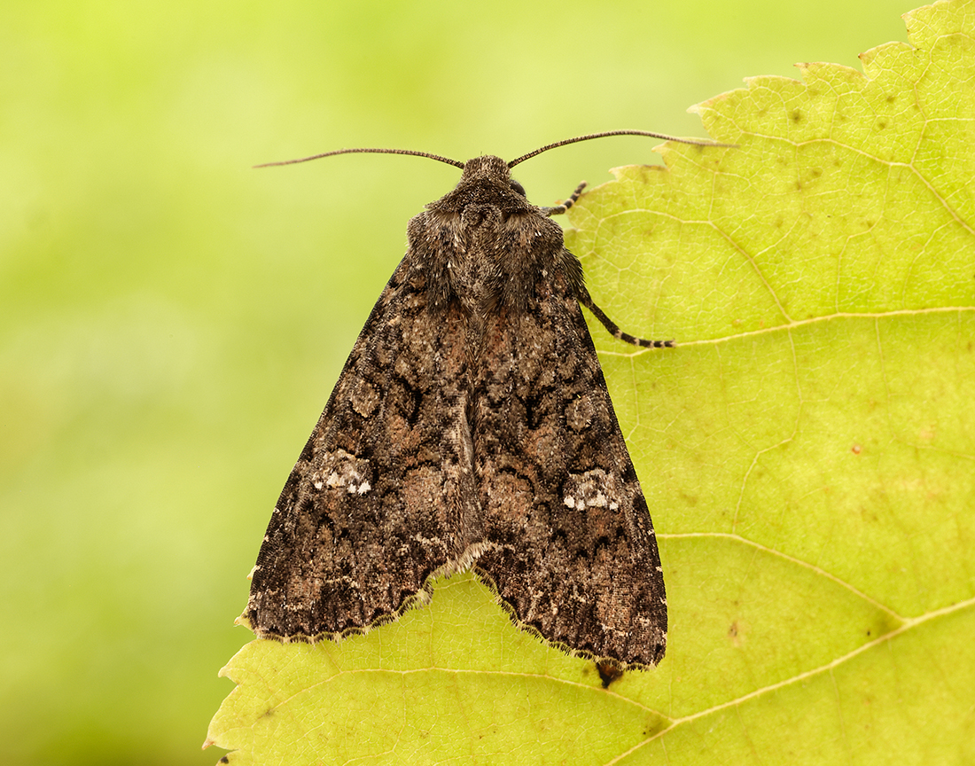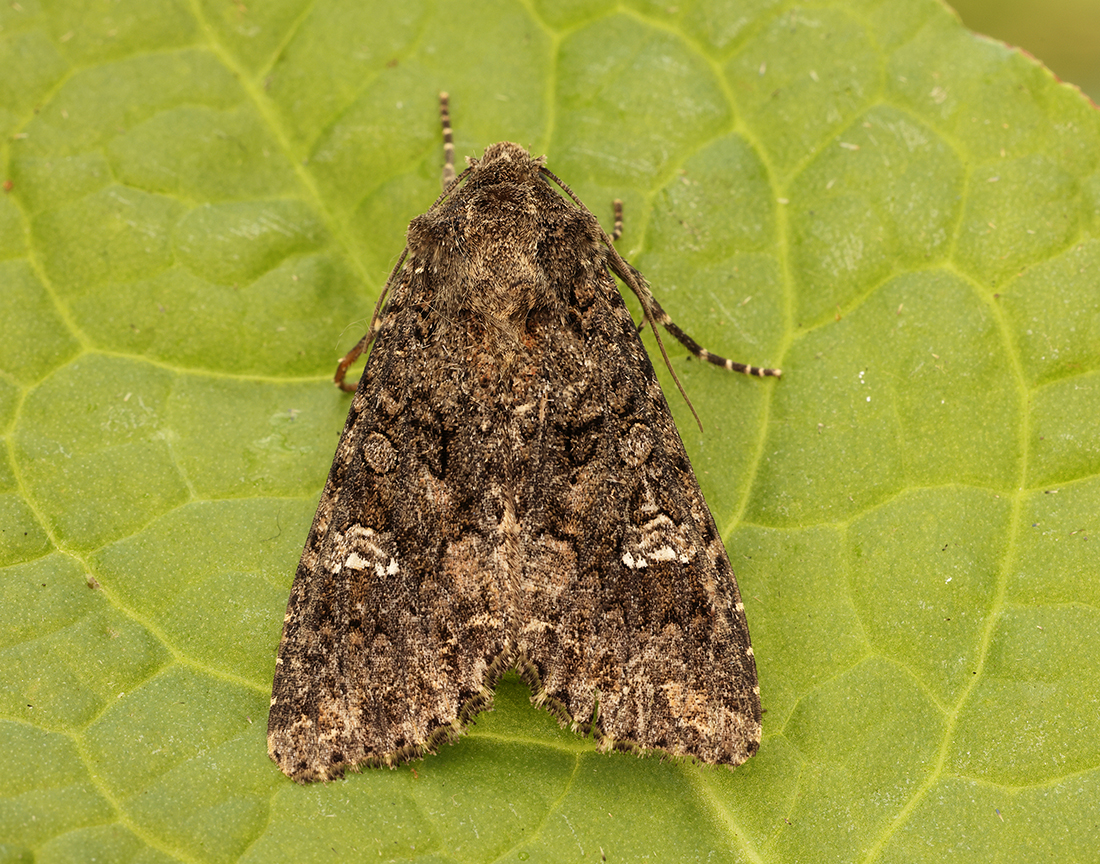 Main features are the chalky-white outline to the kidney mark and whitish inner edge of dark outer band which forms a ‘W’ in the middle. A slightly curved spur on the tibia of the foreleg viewed with a hand lens, separates it from other similar species.