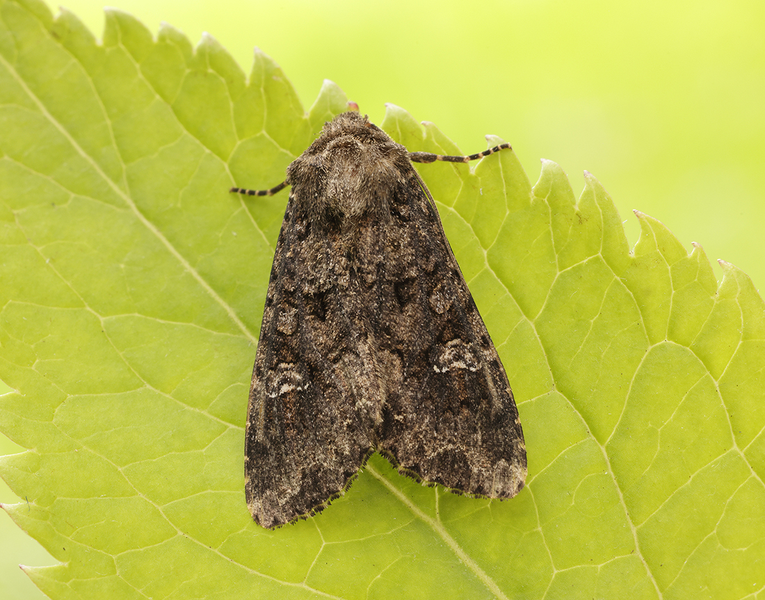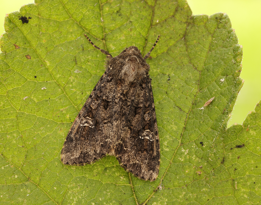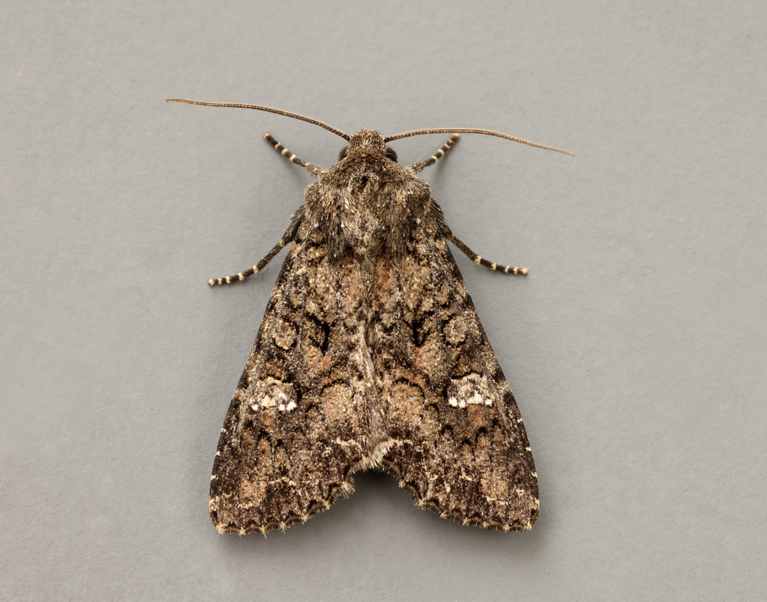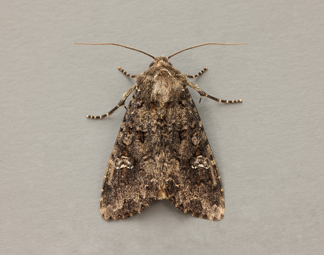 Main features are the chalky-white outline to the kidney mark and whitish inner edge of dark outer band which forms a ‘W’ in the middle. A slightly curved spur on the tibia of the foreleg viewed with a hand lens, separates it from other similar species.
