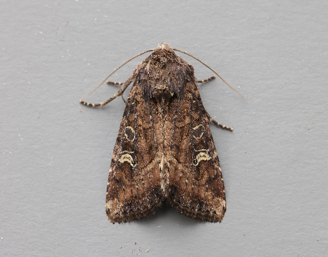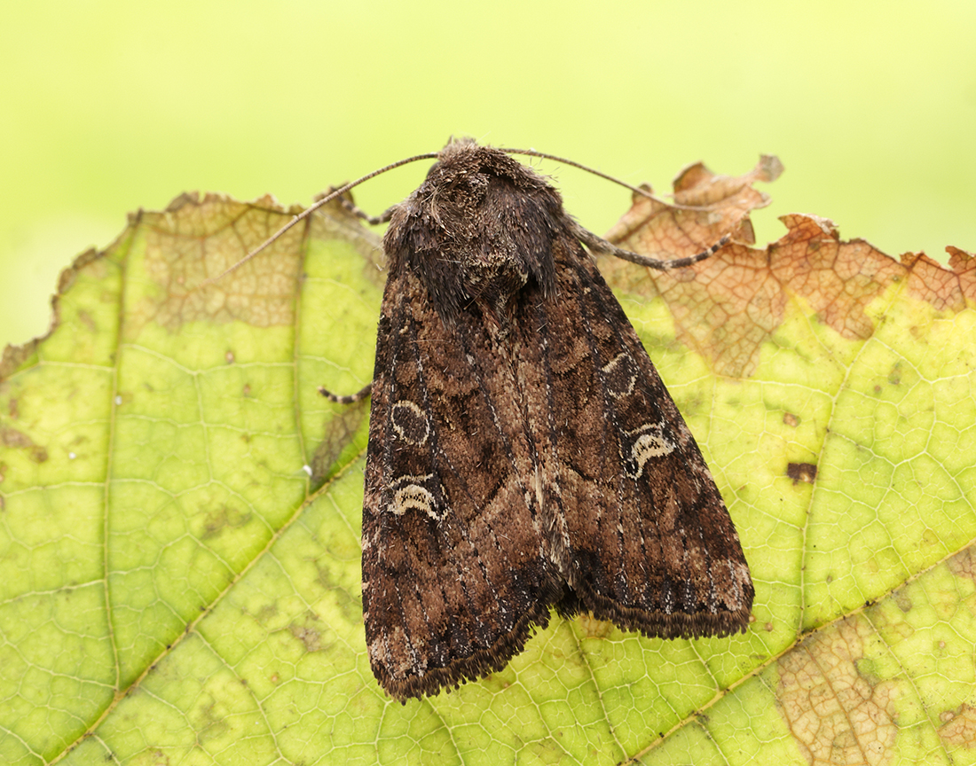A narrow, rather crescent-like kidney-mark on dark chocolate-brown or reddish-brown forewings and a pale outer cross band. A whitish line runs from the oval to the kidney-mark where it forks. Haworth’s Minor is similar but is smaller and lacks the pale outer cross band.