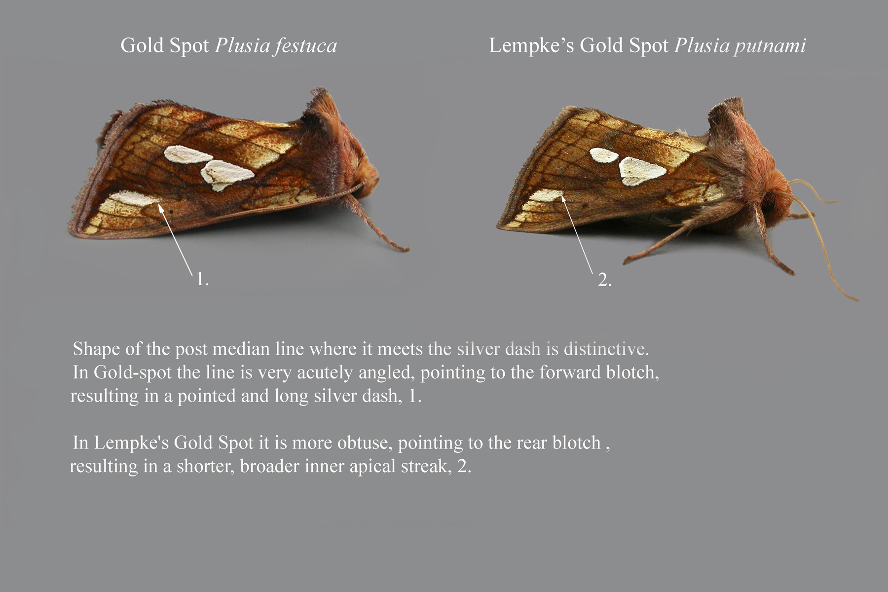 Care is required to separate from Lempke’s Gold Spot. The shape of the post median line where it meets the silver dash is distinctive. In Gold Spot the line is very acutely angled and points towards the forward blotch resulting in a long and pointed inner apical streak. In difficult cases genital dissection may be required. More information here, and here.