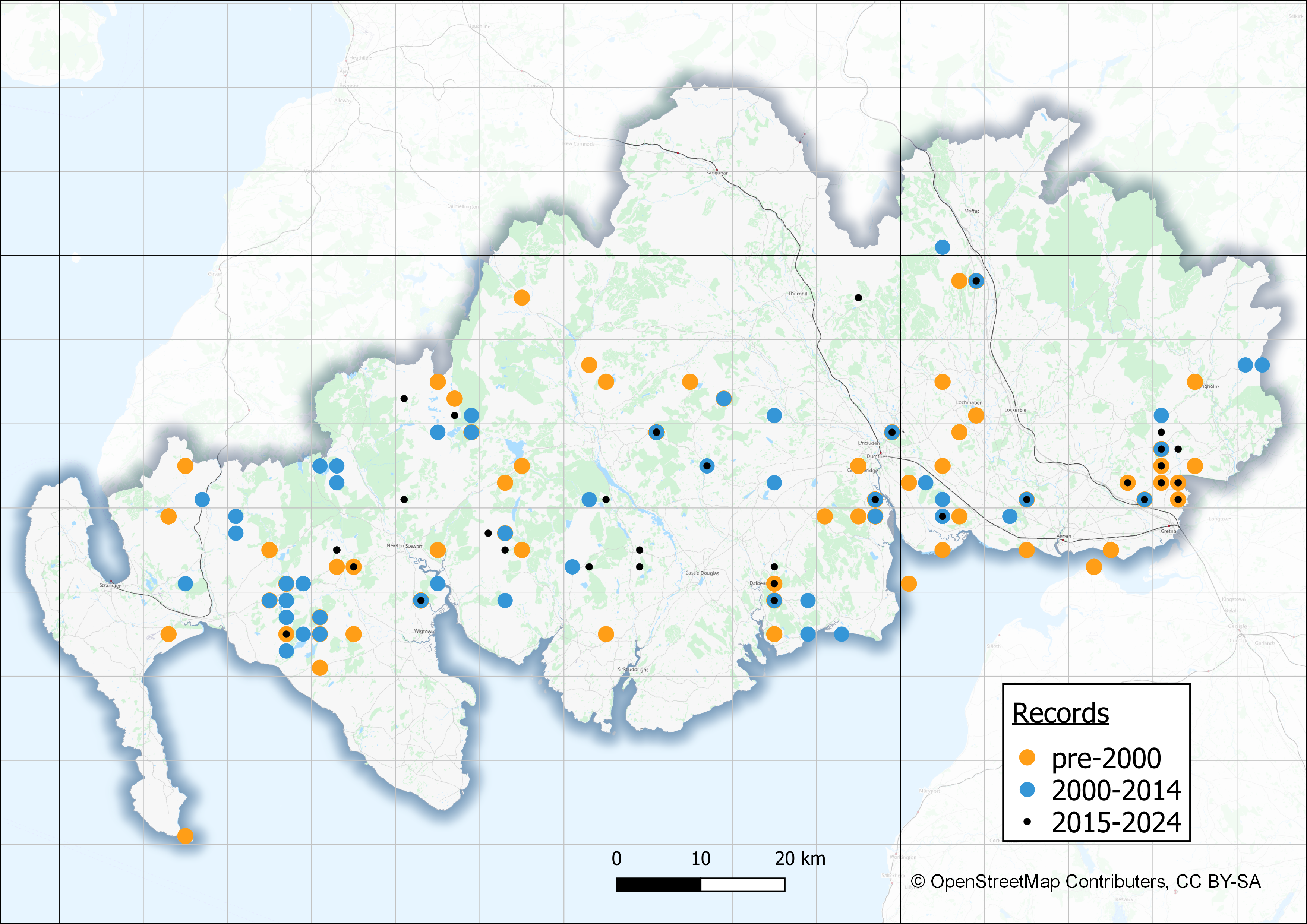 The distribution map for the Large Heath shows far fewer records received since 2015 implying a loss of colonies across the county. This is reflected in other parts of Scotland, and indeed Europe. Both climate change and habitat loss have been suggested as causes. However, the nature of the Large Heath’s habitat, inclement weather on its upland sites, and its reluctance to fly on days without full sun mean that under-recording may be giving a misleading view.