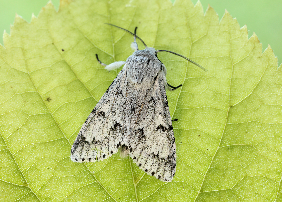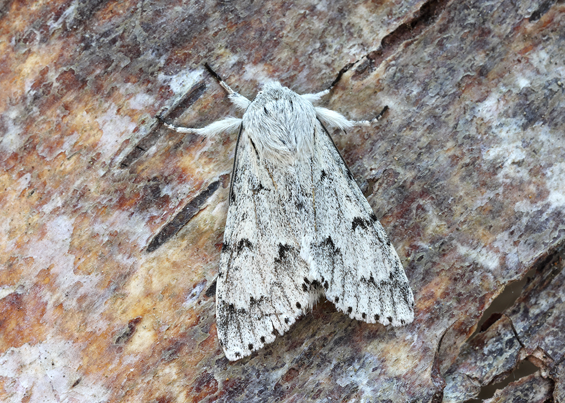 The grey-dusted forewings with fine black markings, especially the black crescent by the kidney-mark are diagnostic.