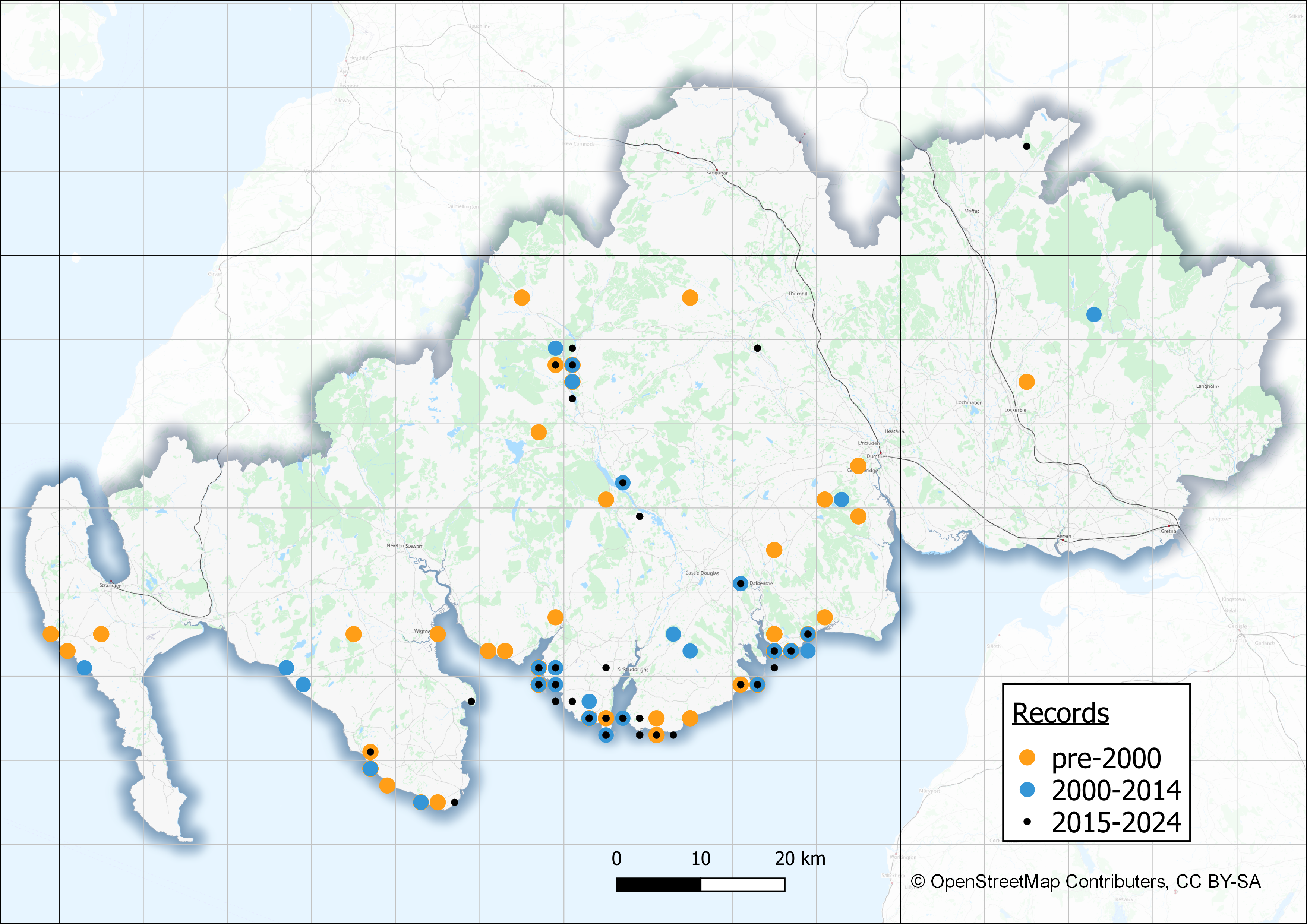 The Northern Brown Argus occurs almost everywhere where its sole caterpillar foodplant, Common Rock-rose grows, but the insect and plant are both are very localised. It is most frequent along the Galloway coast and some inland parts of Kirkcudbrightshire. The Dumfriesshire coast is unsuitable and the very few inland populations are in the west of that county.