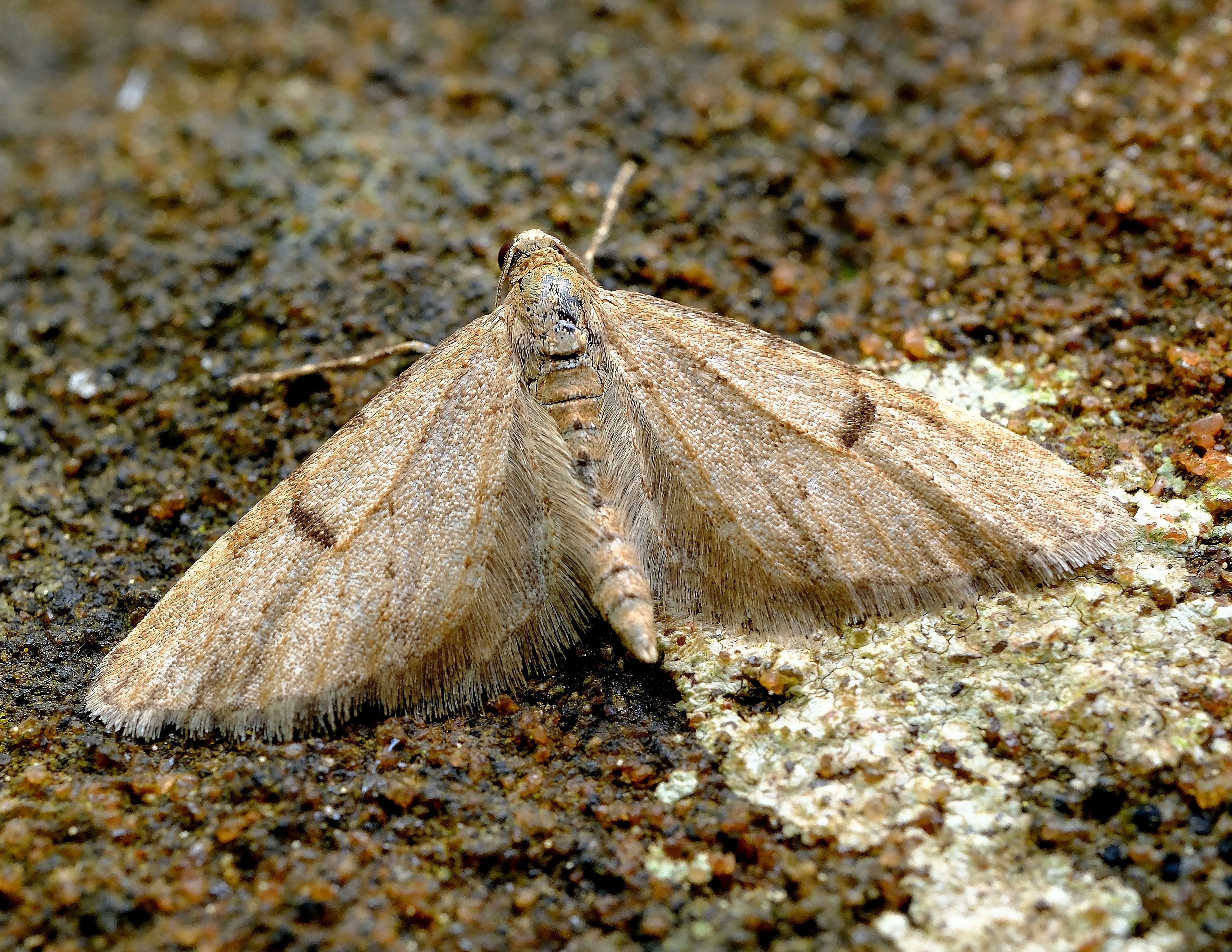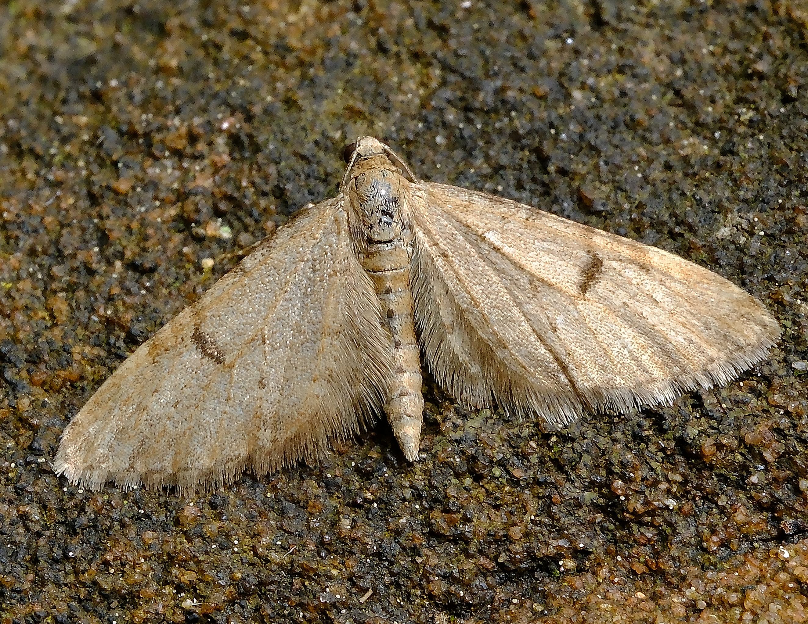 Care required to separate from other ‘pugs.’ Its small size with narrow, pointed sandy or greyish forewings, held angled backwards, with prominent black dash in the central portion and dark spots on the costa should help identify it against Thyme Pug.