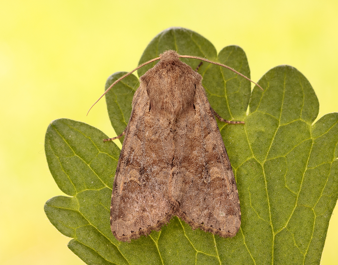 The broad, plain, sandy-brown or greyish-brown forewing with a black basal streak is diagnostic.