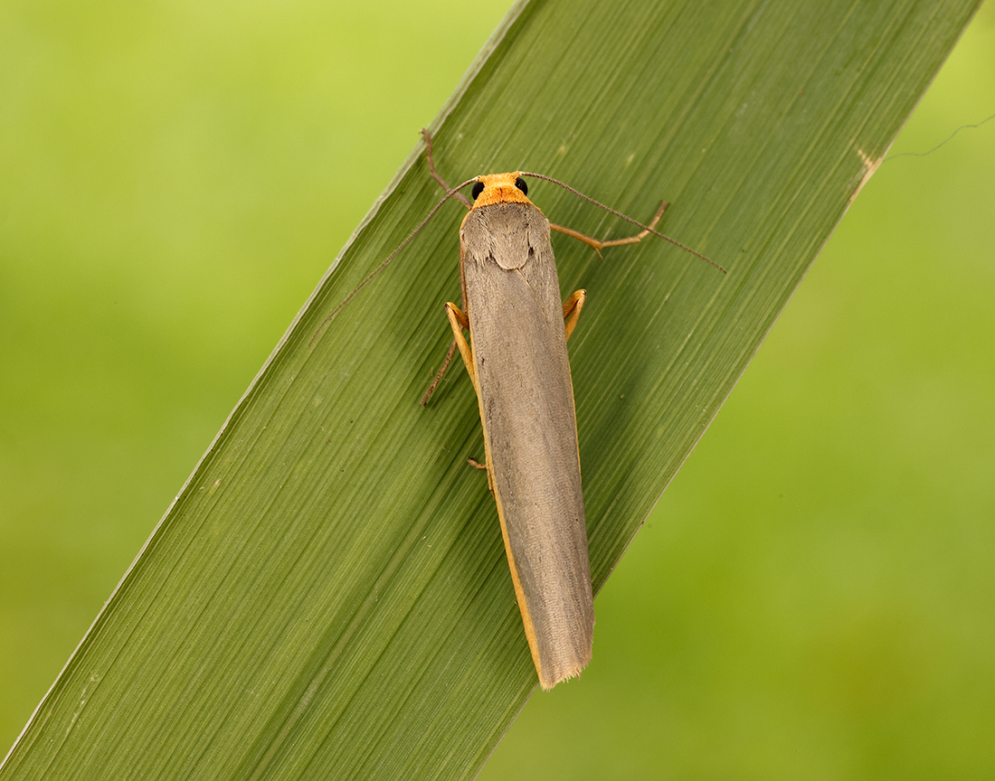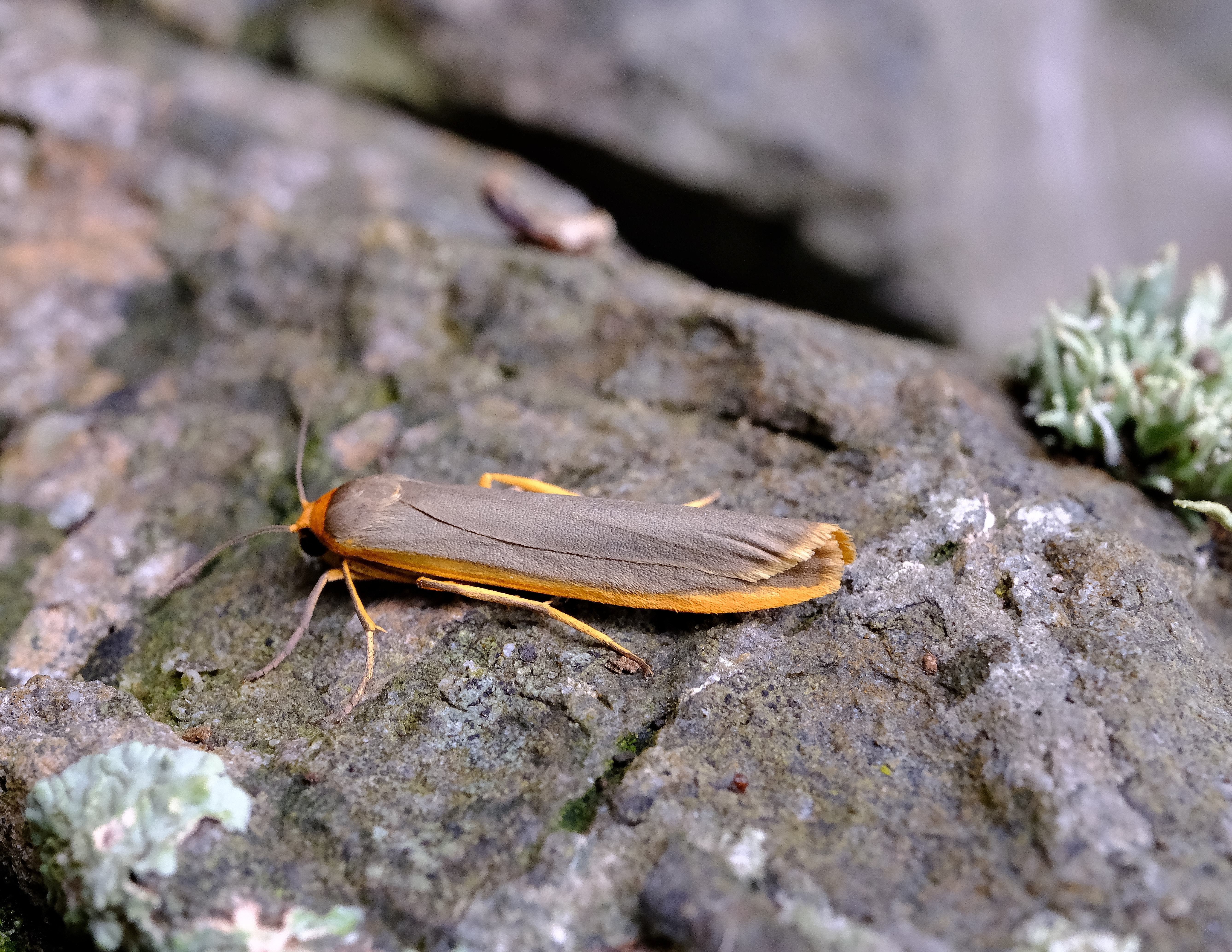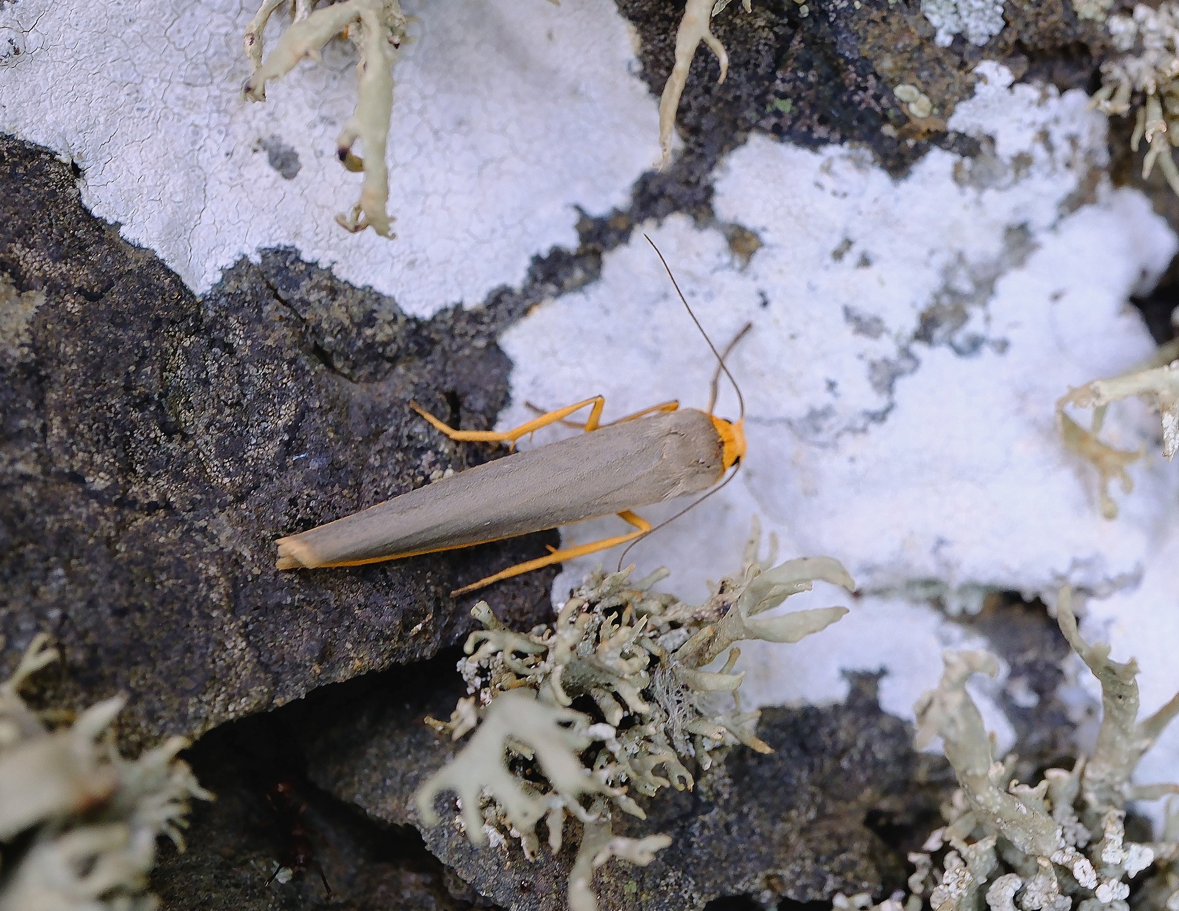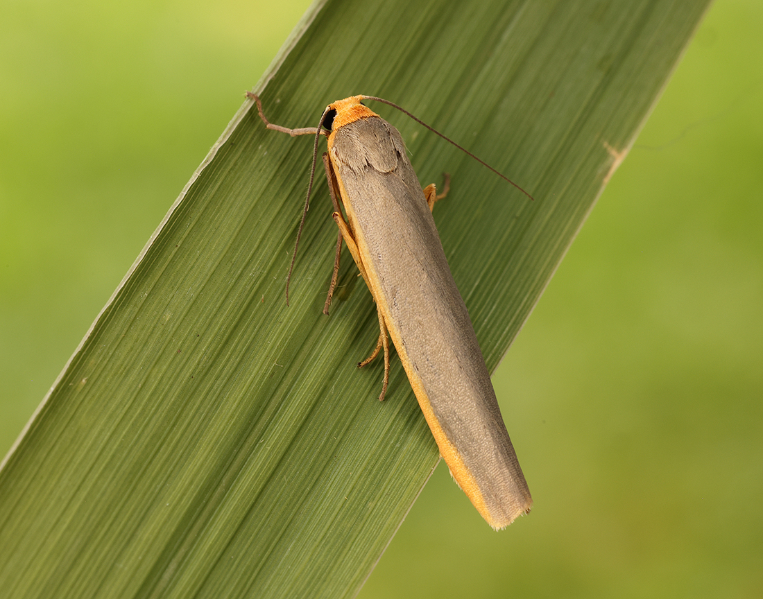 With the wings wrapped around the body and the orange-yellow stripe along the costa being the same width all the way along the forewing will separate it from Common Footman. Another important feature is the complete orange-yellow collar on this species, which has a grey central portion on Common Footman.