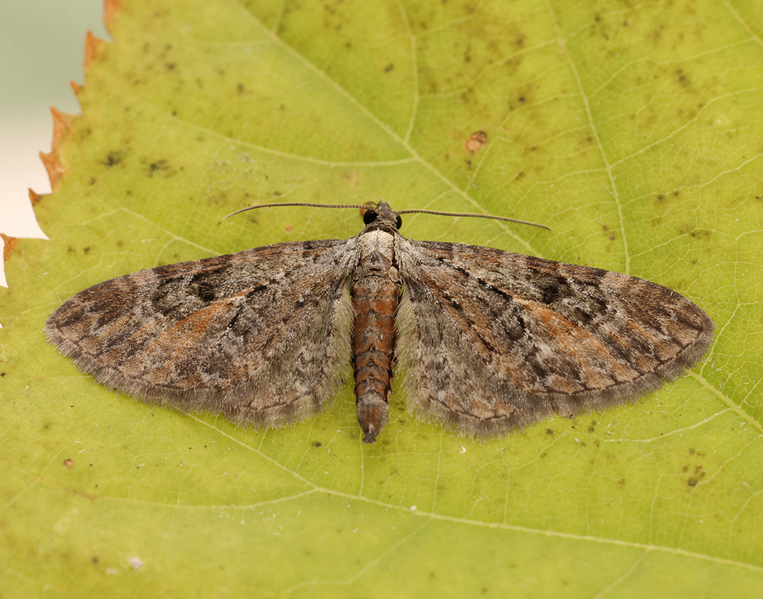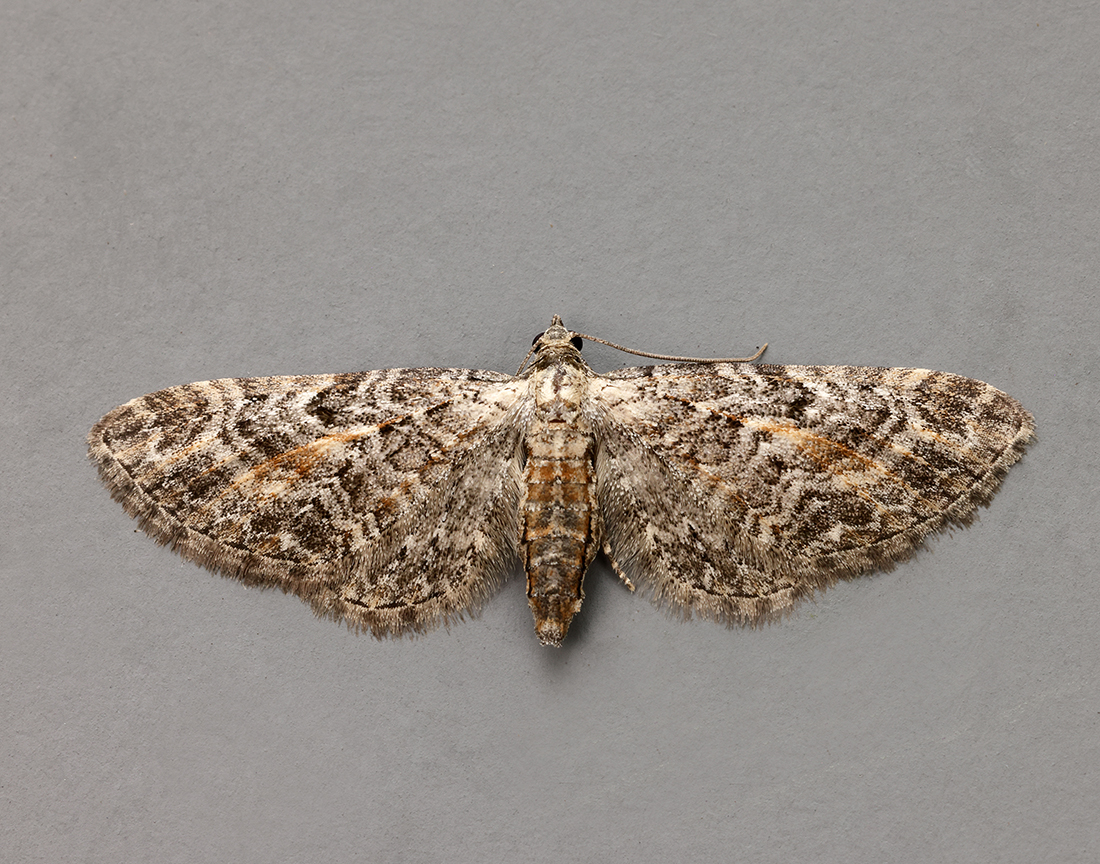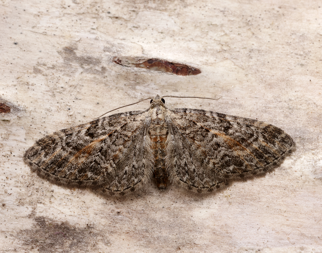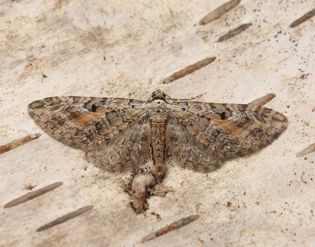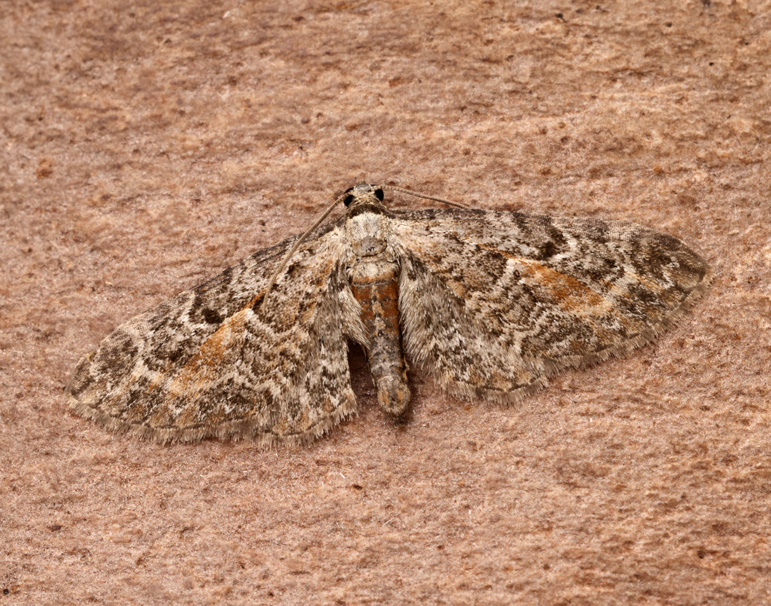 Care required to separate from other ‘pugs.’Two forms of this large pug occur in our region. The typical one has the orange patch on the forewing making it very distinctive and contrasting with form cognata which is a dark grey-brown moth with whitish cross-lines.