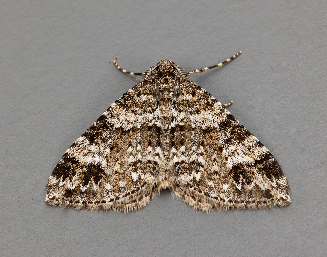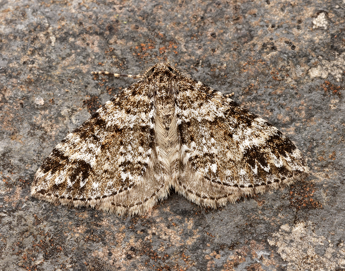 The course texture of the forewing with the twin-spots located inside the scalloped outermost cross-line are diagnostic.